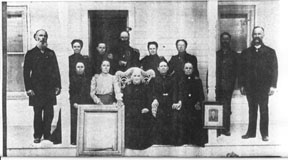 Standing left to right - Sam Rodrick, Jane Rodrick Reynolds, Ellen Rodrick Bache, John W. Rodrick, Catherine Rodrick Baltzell, Isabelle Rodrick Jones, Clinton Rodrick, Uncle Tom Rodrick.