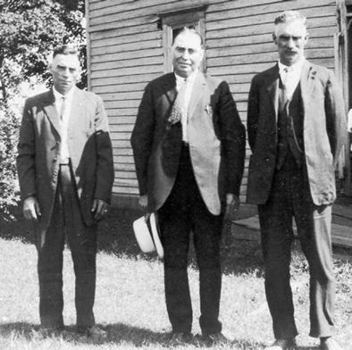 Three brothers (L TO R) John G Angle, Charles H Angle and Frank Angle, G-G-Grandsons of Joseph and Elizabeth Petty. Date Taken: Before 1935 Place Taken: Angle Homestead, Petty twp Lawrence Co, IL. As an added note, their grandmother, Pheobe Vanatta was the daughter of Stephen and Susanna Barnes Vanatta. Susanna's sister, Amelia, was the wife of Jacob Petty, son of Joseph and Elizabeth Petty Submitted by Donetta