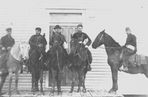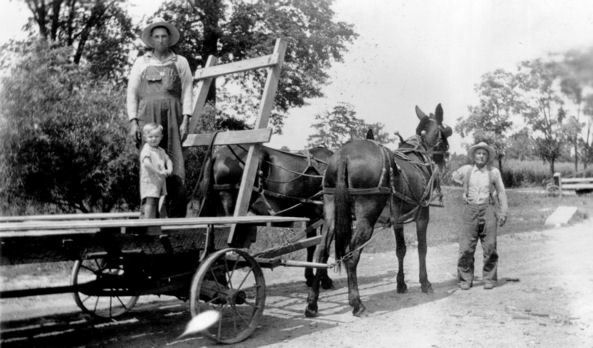 Clarence Trueblood (son of Harvey Trueblood and Laura Petty) is standing on wagon with Larry Waggoner. Standing to the right of the wagon is William "Bill" Campbell. Bill's arm appears to be missing. However, he had both arms throughouts his life Submitted by Donetta