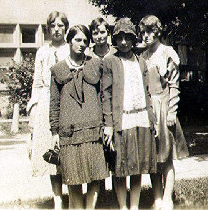 Taken in the 1920's in Charleston, Illinois. Written on back "at Christian Endeavor Convention in Charleston, Mildred Petty, Helen Thorn, Alene Stene, Fae Goodwin and Cleo Vannatta." Helen Thorn is the one in the center of the back row. Alene is on the right, she had wavy red hair. Alene, a registered nurse trained at Barnes Hospital in St Louis, married Herschel Kays and they had a baby boy, Eddie Joe. Alene died of cancer soon after Eddie Joe was born. Eddie Joe died at age 11 months. All this about 1941. Mildred was known to have been tall and wore glasses. Best bet is that she is on the left in the back row. Helen married Ivan Brookhart, Ivan, Mildred, Alene and Cleo are all descendants of Joseph and Elizabeth Petty Submitted by Donetta |